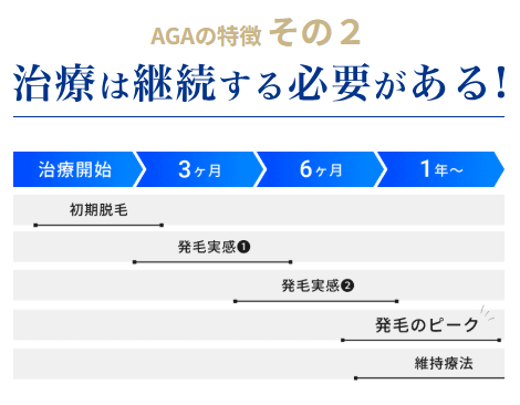 - 6ヶ月以上服用してもAGAの改善がみられない場合は、医師に相談のうえで服用中止を検討。